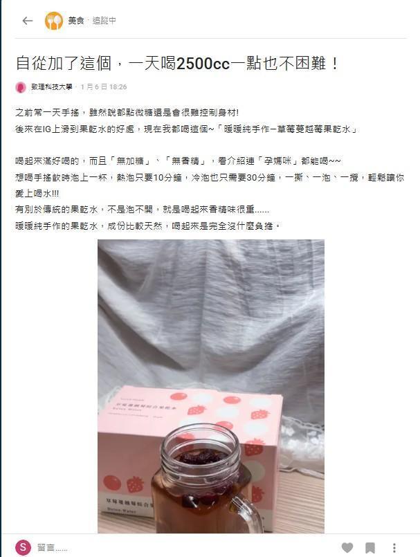 在 Dcard 的討論區中,有網友感嘆:「自從加了這個,一天喝 2500cc 一點也不困難!」 許多網友分享,以前愛喝微糖手搖飲,但現在改喝「暖暖純手作」的果乾水,不僅成分天然,喝起來也完全沒負擔。