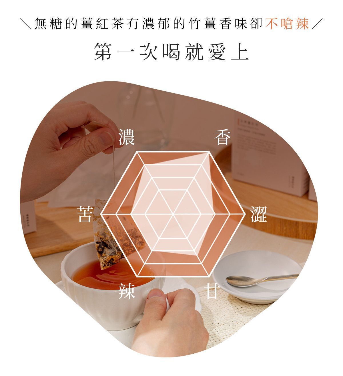 入口先感受紅茶的淡雅清香,接著是竹薑微辣卻溫和的香氣在舌尖慢慢散開。