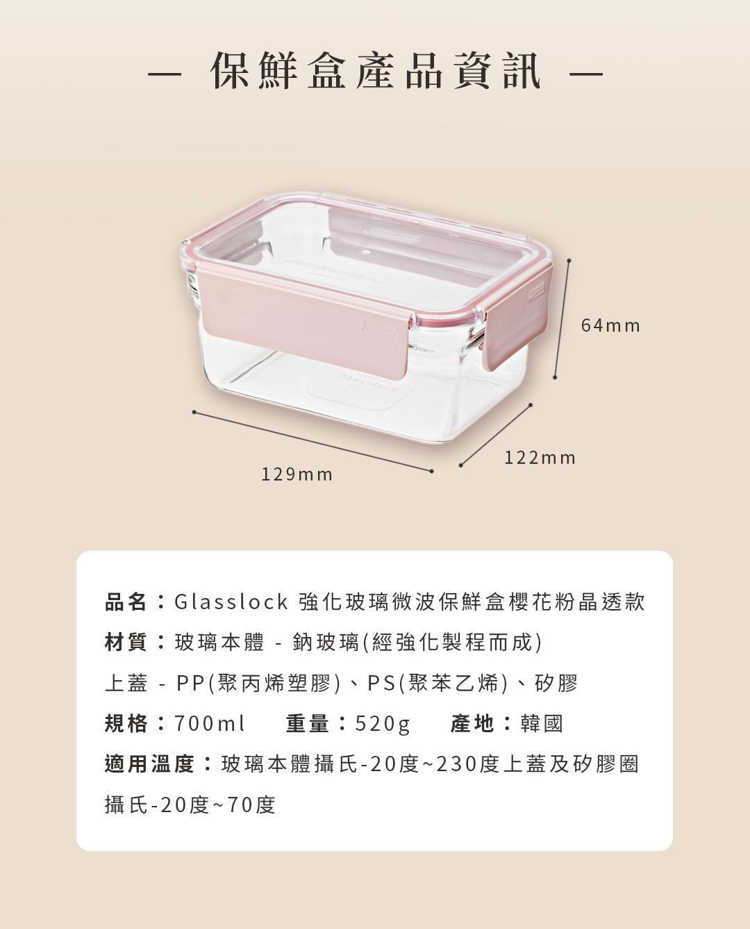 Glasslock 強化玻璃微波保鮮盒 櫻花粉晶透款–長方形700ml