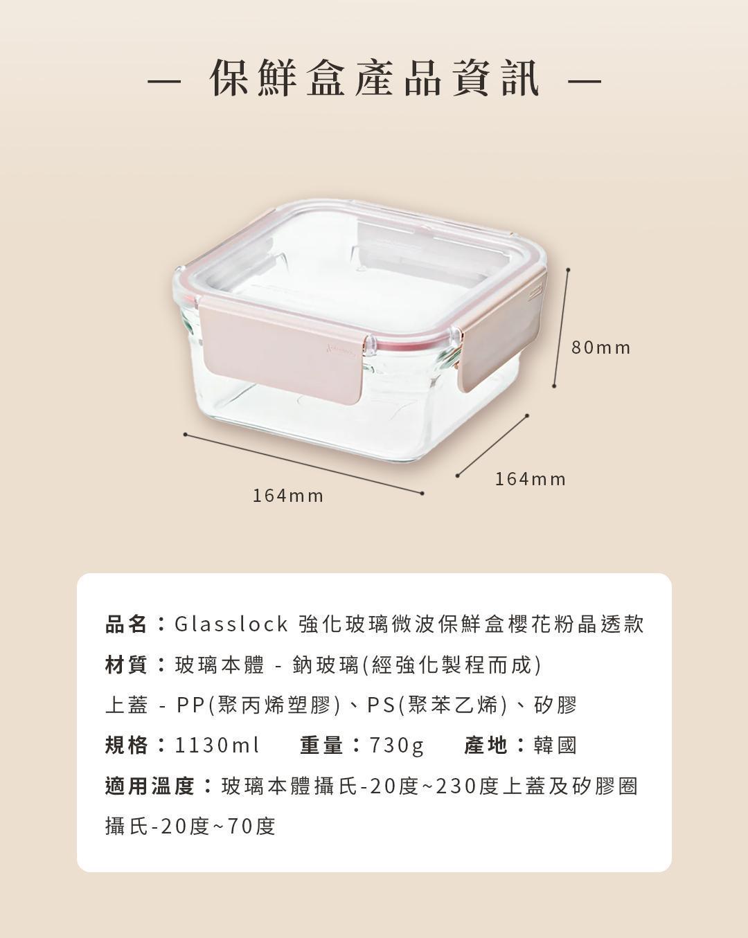 Glasslock 強化玻璃微波保鮮盒 櫻花粉晶透款–正方形1130ml