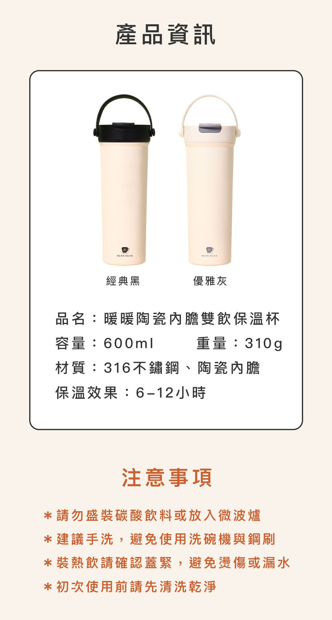 陶瓷內膽雙飲保溫杯600ML,暖暖NUANNUAN - 喝的保養品
