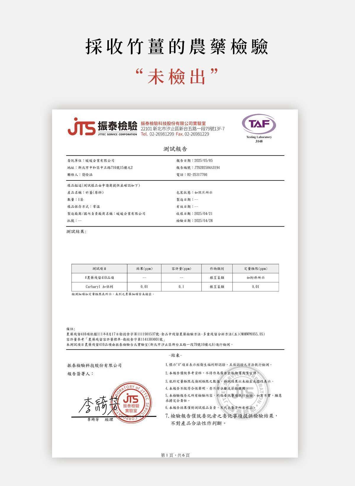 暖暖純手作使用的竹薑原料皆經第三方檢驗單位進行農藥殘留檢測,檢驗結果未檢出。