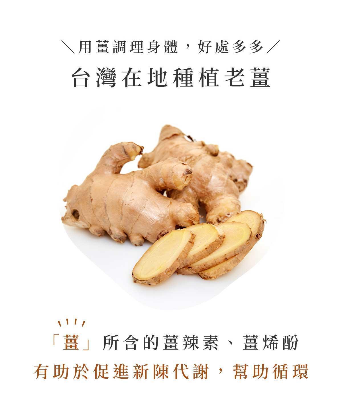 A : 薑依採收時間分為嫩薑、粉薑與老薑。種植10個月以上採收的薑稱為老薑,香氣與辣度較明顯。暖暖純手作選用竹薑中的老薑製作,薑香更加濃郁。