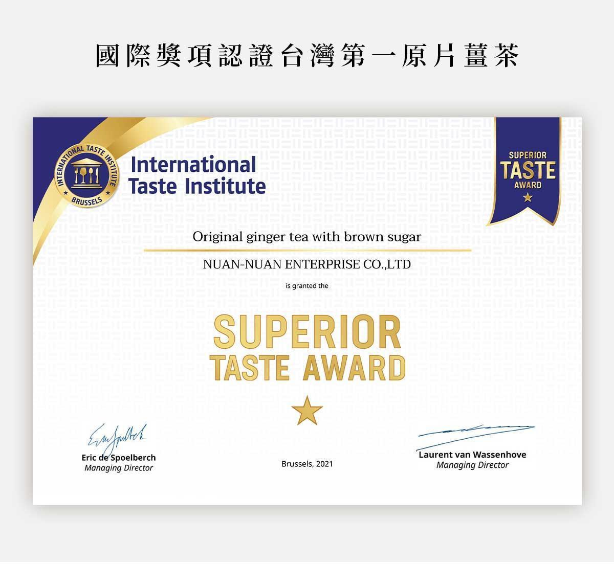 暖暖純手作黑糖原片薑茶榮獲 International Taste Institute(ITI)風味評鑑獎章。