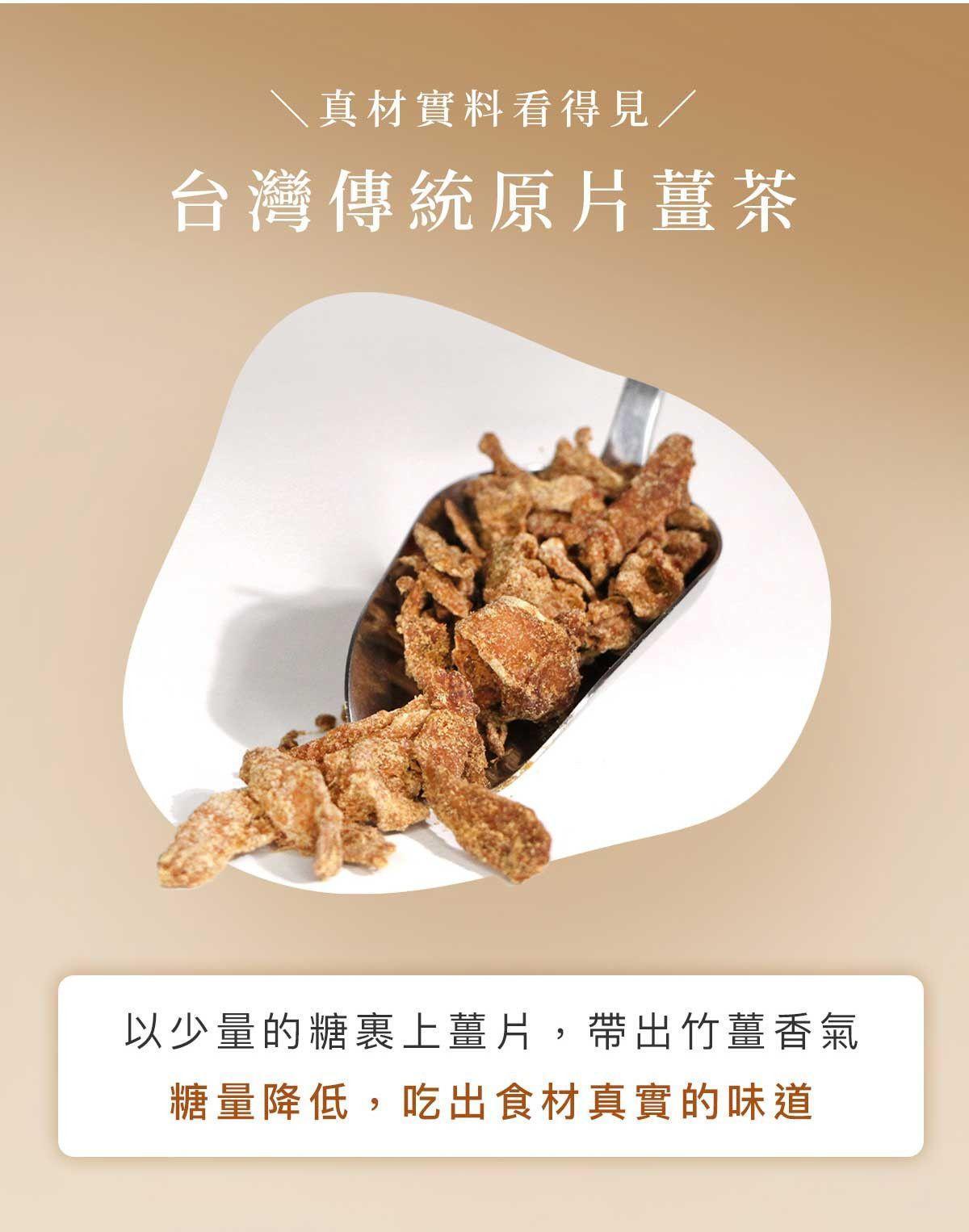 嚴選竹薑原片搭配黑糖調製,不添加人工香料、防腐劑與咖啡因。